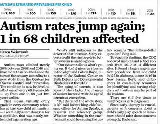 A new study by the Centers for Disease Control and Prevention finds autism affects 1 in 68 children, up from 1 in 88 just two years ago. USA Today says that means virtually every grade in every elementary school has a least one child with autism. Most experts believe the higher rates are due to better awareness and diagnosis and not an actual increase in the number of children affected with the condition.