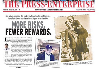 It used to be the crime that sparked headlines and created famous criminals - but bank robbery has seen a big decline nationwide. The Press-Enterprise says there were at least 6,000 bank robberies every year between 1987 to 2006. By 2012, that number dropped to fewer than 3,900. Experts cite improvements in security, more cooperation among law enforcement and longer prison sentences. And many would-be bank robbers believe there are less risky ways to steal money.