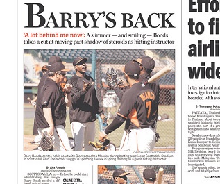 Barry Bonds returned to the San Francisco Giants, for a one-week stint as a spring training hitting instructor. The San Jose Mercury News says Bonds is so slim now, he needed a new pair of baseball pants and he was smiling more than anyone could remember. Baseball’s all-time home run king didn’t talk about steroids and wouldn’t say much about the Hall of Fame.