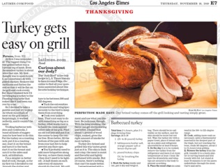 If you’re still hemming and hawing about how to cook this year’s turkey the LA Times has a good suggestion—why not grill it? There are challenges, namely the size. But the advantages—a succulent, smoky bird and lots of extra room in your oven—are tempting, especially if the weather was as nice as it was last year. The Times has step-by-step instructions, which sound surprisingly easy to follow, and even some good ideas for spice-ing up your brine.