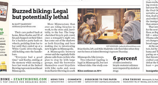 The Minneapolis Star Tribune takes a look at “buzzed biking” in today’s paper. In most states it’s not illegal to ride your bike after consuming alcohol—California and Oregon have laws against it—but it is dangerous, say safety experts. That could change, however, as more and more people come to view their bikes as serious transportation and laws around the country start catching up.