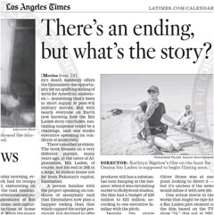 Everyone is grappling with how to process the death of Osama bin Laden including, says the LA Times, Hollywood. Several movies about the Al Qaeda front man that are in production or about to start have paused as their directors and screenwriters try to figure how his death figures into their plot lines. Kathryn Bigelow has a project about the hunt for Bin Laden under way; she and screenwriter Mark Boal are now trying to figure out if and how they must tweak their story.