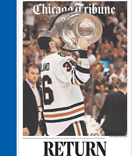The city of Chicago is on fire after its Blackhawks pulled off a stunning come-from-behind win last night to take the Stanley Cup. The Tribune recounts how the Hawks, down a goal with 90 seconds remaining, managed to get two goals in the last 17 seconds, stunning their opponents from Boston and the crowd. The team touched down in Chicago this morning and has been partying, Stanley Cup in tow, ever since.