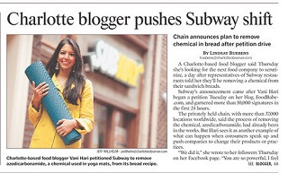 The Charlotte Observer says the blogger whose post prompted Subway to change its bread recipe is looking for her next company to scrutinize. Vani Hari launched a petition on her blog, FoodBabe.com calling on the company to remove a chemical from its bread. Subway said the process of removing the chemical, azodicarbonamide, was already been in the works. Hari says it’s an example of what can happen if people speak up.