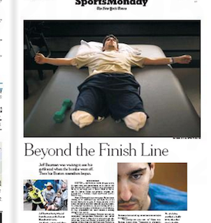 There’s a powerful multipage piece in the New York Times sports section this morning about a Boston marathon bombing survivor’s road to recovery. Jeff Bauman was waiting at the finish line to cheer on his girlfriend when the first bomb went off. He lost both of his legs in the explosion. The Times chronicles the 27-year-old’s life in the months since, from his dozens of surgeries to his final fitting for prosthetics, where he took his first steps since the marathon.