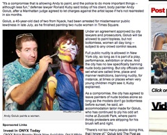 New York City has reached odd settlement with an artist who paints nude women—literally, puts paint on naked women—in public. According to city officials, he may continue doing his thing but his models must keep their bottoms covered until after dark.