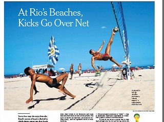 As the World Cup arrives, the New York Times takes a look at Brazil’s other favorite sport, Futevolei. It’s a variation on beach volleyball, where players are not permitted to use their hands. The game started on the beaches of Copacabana in the 1960s. The most dramatic maneuver is the “shark attack” which is like a spike in traditional volleyball, except it’s done with the foot.