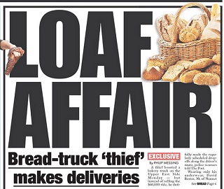 The New York Post has the story of a man who stole a bread truck - and instead of trying to make a getaway - the man dutifully made all the scheduled bread deliveries. In his underwear. The truck thief was eventually caught and taken for a psychiatric evaluation.