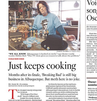 Months after its finale, the LA Times says, Breaking Bad is still a big deal in Albuquerque. Fans are still flocking to the city, taking photos of filming locations and buying methamphetamine-themed items. Law enforcement officials lament that the show has not brought more attention to the city’s real drug problem.
