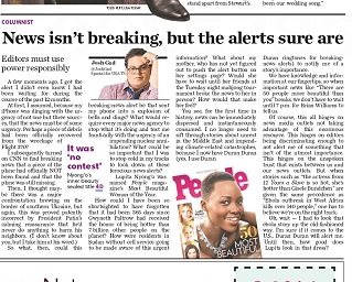 Actor Josh Gad writes a guest column in USA Today decrying the overuse of breaking news alerts by news outlets. He says CNN felt the need yesterday to send an alert to his phone, telling him that Lupita Nyong’o had been named People Magazine’s Most Beautiful Person of 2014. He says editors need to be much more discriminating when deciding what news is worthy of sending out an alert.