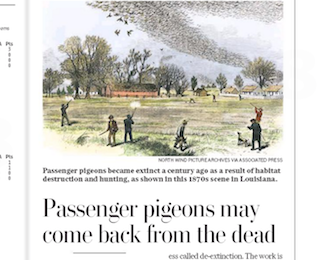 Could passenger pigeons be brought back from the dead? The Washington Post says that’s the plan of a young biologist who is taking a page from the “Jurassic Park” playbook. His idea is to use passenger pigeon DNA taken from museums and “fill in the blanks” with the pieces from a common pigeon. The passenger pigeon, which went extinct in 1914, could be a common sight in less than a year if all goes well.