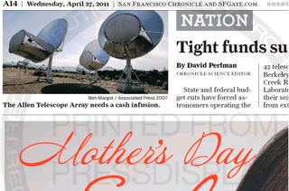 California’s budget woes have reached new heights: outer space. The San Francisco Chronicle says due to a lack of funds the SETI Institute has been forced to shut down its Allen Telescope Array, a series of radio dishes that scan the skies for signs of alien life. Scientists say the timing is unfortunate: 1,235 new possible planets have recently been discovered, dozens of which fall within the “habitable zone.”