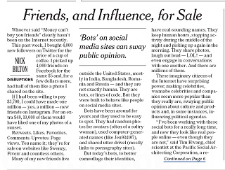 New York Times columnist Nick Bilton says it’s easy to rack up thousands of new followers on Twitter and Facebook. For $5, he was able to gain 4000 Twitter and 4000 Facebook followers. Retweets, likes, shares and comments are all for sale. Bilton says these fake followers can help celebrities and politicians appear more popular than they are, swaying public opinion and even legislative agendas.