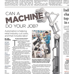 Can a machine do your job? That’s the provocative headline on the front page of today’s Indianapolis Star. The article says automated systems are quickly taking over the retail world, from the grocery store to the factory floor. Calling it a “double-edged sword,” the Star says while machines make life easier for customers, many worry about their effect on employment rates.