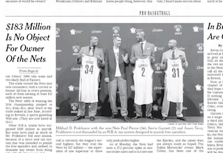 Can the Brooklyn Nets buy a championship? The New York Times says the team’s owner Mikhail D. Prokhorov is spending so much money on his latest player deal that the league’s “luxury tax” on excessive spending will result in an $82 million bill. Next season the team’s payroll will be $101 million, which prompts the Times to call Prokhorov the “Russian George Steinbrenner — only taller, richer and with a cool accent.”