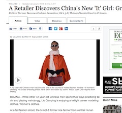China has a new “it” girl, says the Wall Street Journal. A former rice farmer, 72-year-old Liu Qianping was catapulted to fame after his granddaughter used him to advertise her struggling fashion line. “He’s just so slender,” says the granddaughter, whose sales have quadrupled since Mr. Liu’s debut. For his part, Liu says he doesn’t mind donning a wig, or wearing lacy green tights to help out his family: “She only has me wear clothes I think look good.”