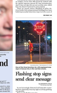 The Kansas City Star says “in our increasingly distracted and inattentive motoring lives” it takes more that just a plain red stop sign to grab our attention. That’s why more and more communities around the country are outfitting their traffic signs with LED lights. Experts say it’s not that people don’t know what a stop sign indicates—it’s one of the most iconic symbols in the world. Instead, they say as the number of distractions available to us increases their biggest challenge is to create signs of ?increased conspicuity.?  Let’s just hope the towns that’ve adopted the new solar-powered sign don’t also decide to host a bull run.