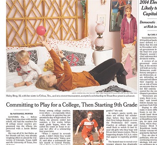 The New York Times says more and more college coaches are recruiting athletes before they even get into high school. Coaches exploit loopholes in NCAA rules in a race to fill up their rosters before rival coaches get their hands on talented young athletes. The Times says the problem is more pronounced among girls both because girls mature faster than boys and also because Title IX has vastly increased the number of scholarships given out to girls.