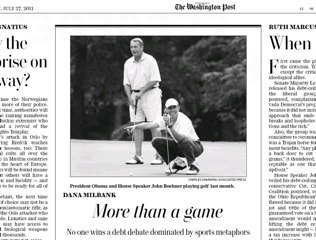 Last week, President Obama told the nation, “we’re in the same playing field.” Speaker of the House John Boehner countered by saying “the ball continues to be in the president’s court.” Dana Milbank’s Washington Post column this morning points out just how many sports metaphors are being lobbed back and forth by both sides in the ongoing debt ceiling talks. The only problem, says Milbank: our debt crisis is no football game. He writes: “If you lose the full faith and credit of the United States, you don’t shake hands at midfield and meet for a rematch later in the season.”