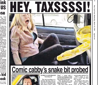 Comedian Jimmy Failla, is in trouble for using a New York City cab for a YouTube hidden camera video called “Snakes in a Cab.” The New York Post says Failla picks up passengers, then pokes a live python at them, filming their horrified reactions. The Taxi and Limousine Commission says Failla exercised “monumentally poor judgement.”
