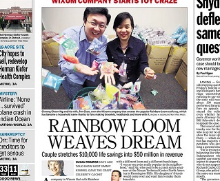 The Detroit Free Press catches up with Cheong Choon Ng, the Michigan entrepreneur who saw his two girls weaving bracelets out of pony tail rubber bands and came up with the idea for the Rainbow Loom. Ng was able to convince his wife to use their $10,000 in savings to bring the idea to the market. It won Toy of the Year last year and the company saw $50 million in revenue.