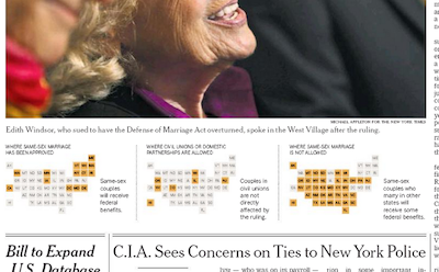 The Supreme Court’s landmark decisions regarding same-sex marriage are thoroughly covered on the front page of the New York Times this morning, including some well-presented maps showing where gay marriage is and isn’t permitted in the US. Writer Adam Nagourney says the court followed the nation’s lead yesterday with its decision that DOMA was unconstitutional, noting that 30 percent of Americans now live in states where same-sex marriage is legal.
