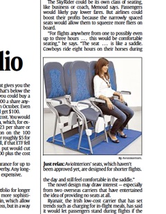 Both Ryanair and a Chinese airline have expressed interest in offering standing room seating on short flights. For those worried that the seat might feel cramped, a company spokesman offered this assurance: “The seat ... is like a saddle. Cowboys ride eight hours on their horses during the day and still feel comfortable in the saddle.”