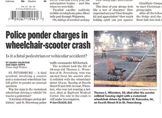 Police in Florida are puzzling over how to classify a recent accident involving a motorized wheelchair and a scooter. The man driving the wheelchair struck and killed the man on the scooter after pulling out into the street mid-block. The question that remains, says the St. Petersburg Times, is whether the surviving man should be charged with jaywalking or reckless driving.  Police say the decision could hinge on how much horsepower the motorized wheelchair had.