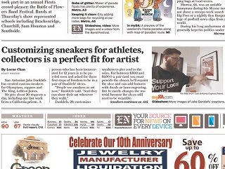 The San Antonio Express-News profiles Jake Danklefs, an artist who customizes sneakers for a living. He gets about 20 requests a day for custom designs for which he charges anywhere from $300 to $1000 a pair, and you must include the shoes. He’s designed for LeBron James and Olympic sprinter Justyn Warner among others. Danklefs doesn’t change the integrity of the shoe, but customizes them using paint, decals or laser engraving.