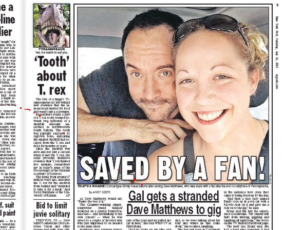 A funny thing happened on the way to the Dave Matthews concert in Pennsylvania over the weekend. Two fans were driving to the show when the stopped to pick up a hitchhiker whose bike tire had popped by the side of the road. Turns out it was Dave Matthews himself, who’d gone for a pre-show ride without his cell phone. The couple had luckily just installed a bike rack on top of their car and were rewarded with two back-stage passes, dinner and a shout out from the singer.