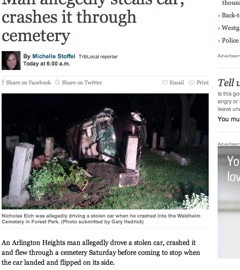 The Chicago Tribune says an Illinois man’s decision to steal a car ended with an ironically cautionary tale. After a cop spotted the stolen vehicle on the road, the car thief gunned it down a dead-end, hit the curb and landed between several headstones at a local cemetery. Workers estimate the car traveled 130 feets, most of it through the air, before landing. Luckily, any potential victims were tucked six feet under ground.