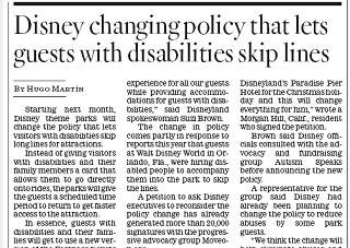 Disney theme parks are eliminating a policy that allowed disabled guests to skip to the front of the line for attractions. The Los Angeles Times says the move is partly in response to reports that visitors to Walt Disney World were hiring disabled people to go with them to the park to help them skip lines. Instead disabled guests will now get a version of the FastPass ticket that gives them a scheduled time for faster access to the attraction. Disney says it wants to create a more consistent experience for its visitors.