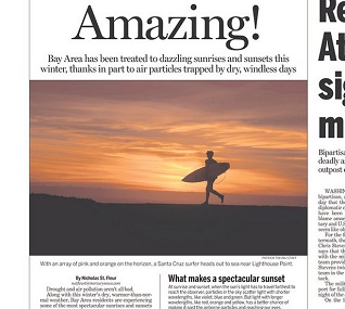 Pollution isn’t all bad. This winter’s dry air in California has been leading to some spectacular sunrises and sunsets. Scientists tell the San Jose Mercury News that pollution particles trapped in the dry air scatter light to create the beautiful array of colors. One meteorologist says go ahead and take pictures, just don’t breathe.