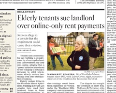 The LA Times says a new policy to accept only online rent payments has rankled the residents of an apartment complex in Los Angeles. The landlord calls it a “green initiative.” But the elderly residents say it’s using their “digital shortcomings” against them, and that it’s discrimination.