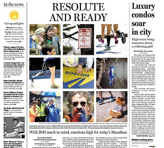 The Boston Globe says emotions are running high in the city ahead of today’s marathon. The mood seems upbeat, with many speaking of unfinished business and the desire for a return to normalcy. The paper says it was fitting that the Marathon comes the day after Easter which for many symbolizes resilience.