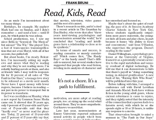 New York Times op-ed columnist Frank Bruni says teens need to read more. Bruni cites statistics that show teens today are reading much less than their counterparts 30 years ago. He says that’s a shame since he believes reading does something to the brain, heart and spirit that movies, television and video games cannot.