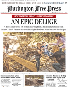 Upstate New York and Vermont have been hit with epic flooding in the aftermath of Hurricane Irene. How did it happen? The Burlington Free-Press says it was a “perfect and tragic combination” of Irene’s path, the air masses that hung in the way and the topography of the region. Writer Matt Sutkoski paints a great picture of the scene in Vermont, which, from the sound of it, bordered on the surreal: “Big hay bales wrapped in white tarps floated crazily in the aptly named Mad River like marshmallows in a sinister hot-chocolate flood. The scene made me think about the farmers losing their crops, maybe their barns, maybe their animals, maybe their livelihoods.”