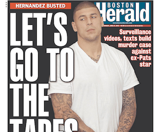 Ex-Patriots star Aaron Hernandez fills the front page of the Boston Herald. In light of the NFL star’s arrest yesterday for the alleged murder of a semi-pro football player and the loss of his $40 million Patriots contract, columnist Jerry Sullivan notes that 29 pro football players have been arrested since the Super Bowl on February 3. He admonishes those who’ve said Hernandez’s arrest is a sad day for the league, writing that it’s the victim’s family who should be the object of our sympathy, not the NFL.