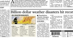 Our year of crazy weather has set a new record, says the Houston Chronicle. Damage caused by twelve of 2011’s tornados, earthquakes, fires and hurricanes topped the one billion dollar mark. The recent wildfires in Texas, New Mexico and Arizona added two more billion-dollar catastrophes to the list, pushing the total to its new heights.