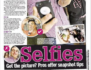 The focus is on ‘selfies’ in today’s New York Daily News. The paper asks pros for some tips to help you navigate around double chins and weird shadows and come up with great looking headshots. One tip is to hold the camera either too high or too low, to create an interesting angle. Another is to choose a flat surface as a background and wear something in a contracting color.