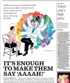 You know those drug commercials that tell you to “ask your doctor if X is right for you?” Well, they are killing the primary-care physician says the LA Times. Family doctors are overworked these days, in part because patients are demanding more from them. There’s an added pressure to complete so many tasks in the alloted 15 to 20-minute appointment—“more preventive services, more care for chronic diseases, more healthful lifestyle coaching, more screening for depression and risky behavior (guns? cigarettes? bike helmets?), more delicate discussions (prostate biopsy? end-of-life wishes?), more documentation and now electronic records”—that many medical students are opting to specialize instead; the number of American medical students who opted to study primary care dropped by nearly one-half over the past decade. Part of the problem, according to experts, is that most insurers only reimburse doctors for face-to-face visits, killing the incentive to implement time-saving appointments by phone or email.