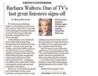 Washington Post television critic Hank Stuever calls retiring Barbara Walters “one of America’s last great listeners.” He says she asked many of the questions we wanted answers to and never seemed to make her interviews about her. A Barbara Walters interview, Stuever says, meant that whatever the issue of the moment was, it had reached its apex.