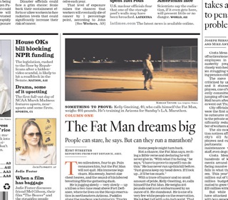 He calls himself the fat man. Weighing in at 405 pounds with a five-foot waist, it’s easy to see how that nickname stuck. But according to the LA Times, Kelly Gneiting isn’t embarrassed about his size—in fact, he contends that he is one of the best athletes in the world. To prove his theory, he’s training for the LA marathon. And he hopes that when he crosses the finish line on Saturday he’ll set a Guinness record as the heaviest person to do so.