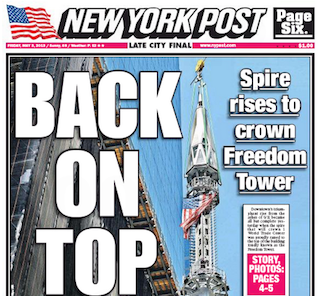 The New York Post did a nice job with its photos of the final piece of One World Trade Center being lifted into place. The headline on page one is “Back on Top.” Apparently there’s still some debate whether the top of the building is a spire or an antenna ...which has a different meaning on where the Freedom Tower ranks on the list of tallest buildings. MORE PHOTOS