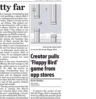 Developer Dong Nguyen has kept his word - pulling the popular game Flappy Bird from the Apple App Store and Google Play. USA Today says Flappy Bird’s popularity peaked last week and on Saturday, Nguyen sent a tweet saying he planned to remove the game from the marketplaces. During an interview last week, Nguyen said he was making $50,000 a day from ads placed in the game. But other tweets from Nguyen suggested he may have been struggling with all the attention the game was receiving.