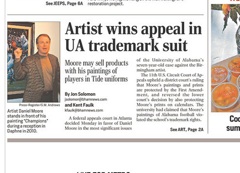 An artist has come out victorious in a seven-year legal battle with the University of Alabama, reports the Birmingham News this morning. Daniel Moore was sued by the school because of his paintings, which depict Alabama football players in uniform. The U of A claimed Moore’s images constitute copyright infringement, but a judge decided yesterday that they are protected under the First Amendment.