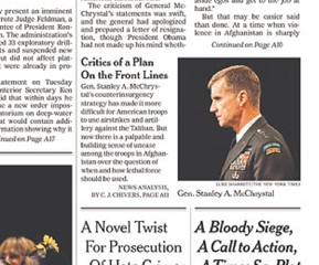 The New York Times asks a question I spent hours trawling Google for an answer to yesterday: “Why would a top military commander allow a journalist so much unfettered access to his inner circle?” Turns out that due to the ash from the Icelandic volcano, the journalist who penned the controversial Rolling Stone article, Michael Hastings, was stranded with General McChrystal and his staff in Paris for two days. Hastings then traveled to Berlin with the General and his staff and later accompanied them on several trips to Afghanistan. Asking whether General McChrystal had opened up because he thought of Rolling Stone as a less than serious magazine; the editor in chief replied that it “would not be the first time a political figure opened up to the magazine.”