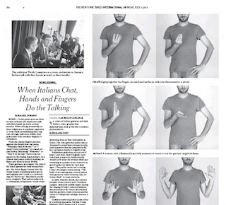 Italians don’t just speak with their mouths, says the New York Times in a fun feature about the role hands play in the Italian language. There’s the “classic fingers pinched against the thumb” (What are you talking about?) and the the “hand circled slowly, indicating ‘Whatever.’” And don’t forget the “what do you expect me to do about it?” gesture—two hands in prayer mode shaken back and forth. (If you’re lost, the Times has an awesome interactive guide to get you up to speed.)