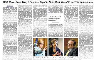 The only three Democrat senators from the South are facing tough re-election battles next year. The New York Times says the GOP is going hard after the seats held by Senators Mary Landrieu of Louisiana, Mark Pryor of Arkansas and Kay Hagan of North Carolina. The Times says the outcome of their re-election bids could determine whether the Southern Democrat is headed for extinction.