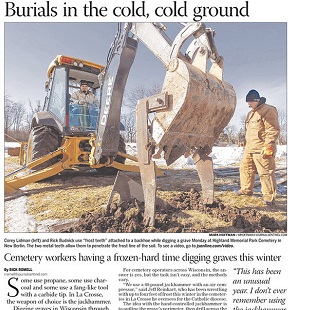 For all the talk of the polar vortex this winter, few have stopped to consider the plight of the grave digger. The Milwaukee Journal-Sentinel says cemetery workers have had to bust out the big guns to break through the frozen ground this winter. Workers use jackhammers to outline the grave, and special “frost teeth” on the backhoe that digs the grave.